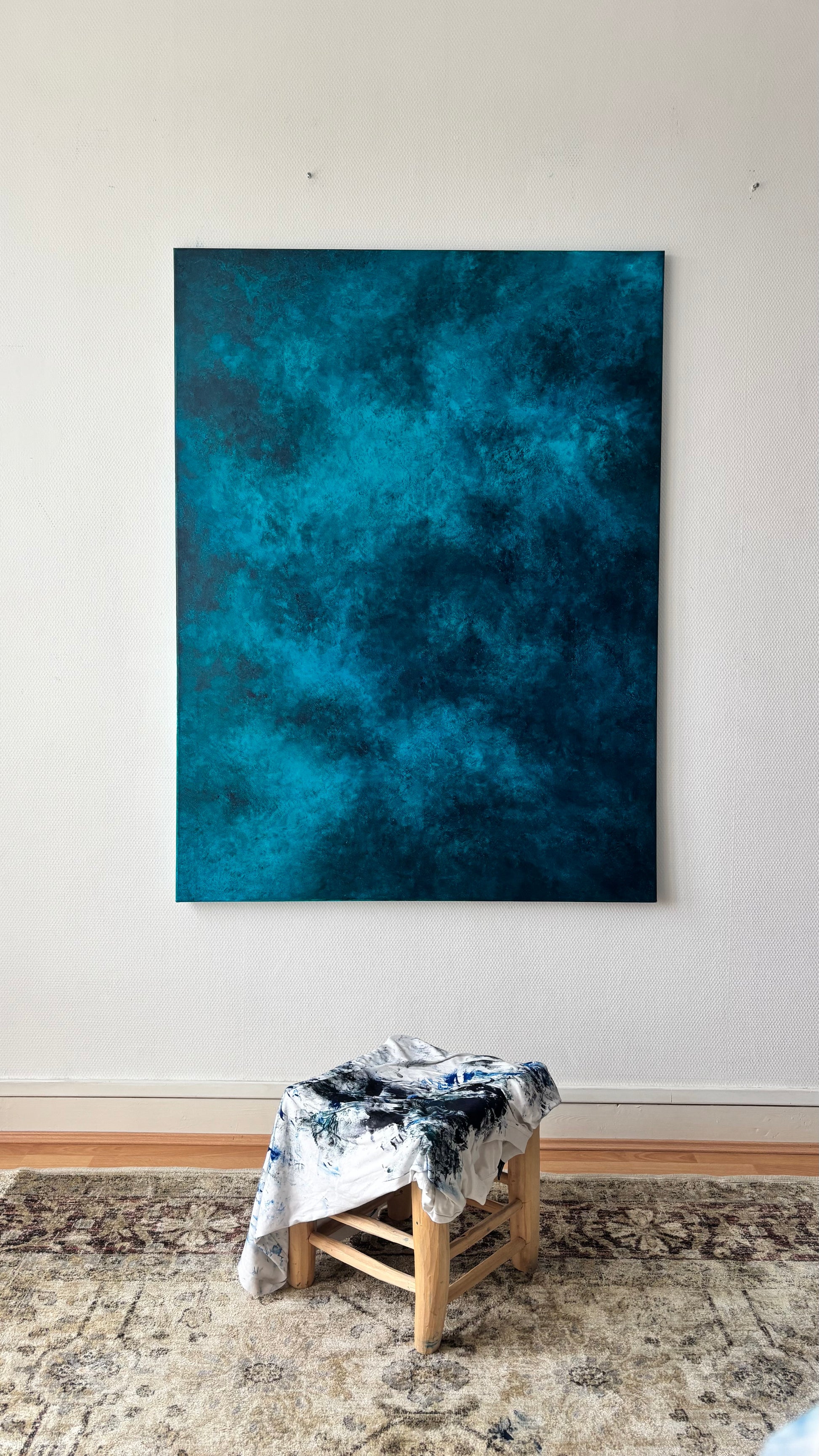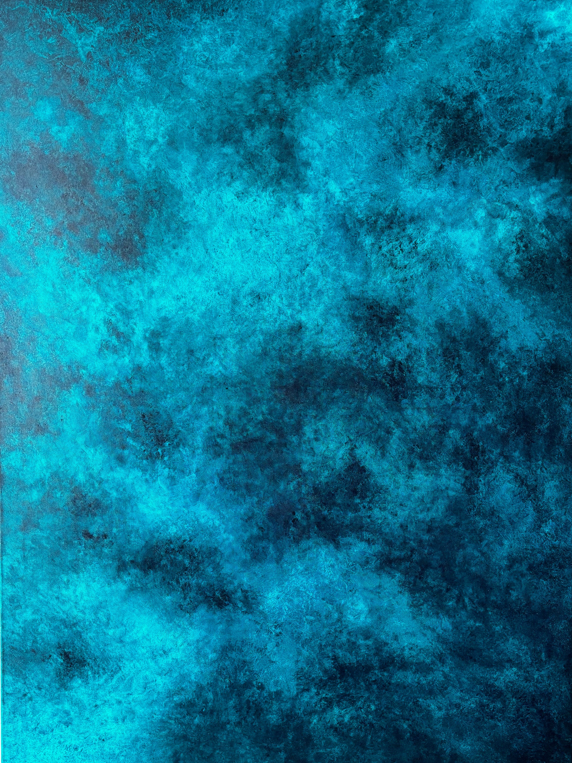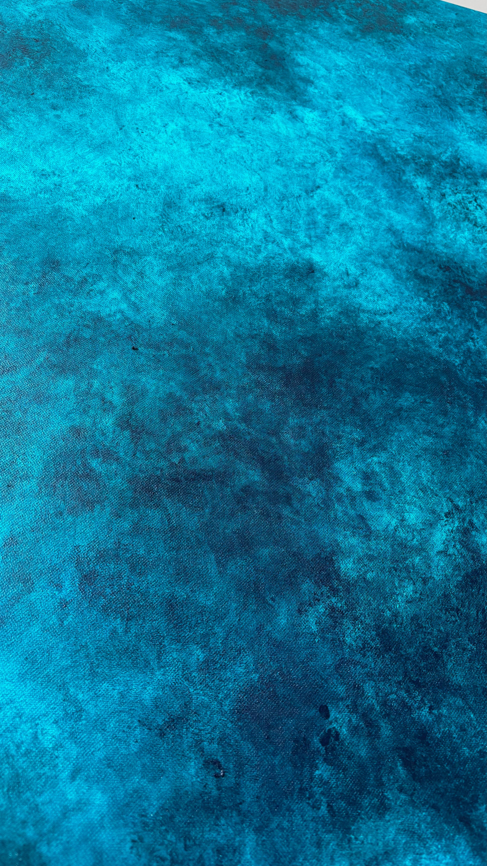 J’ai choisi de non vernir mes toiles pour laisser l’œuvre continuer à vivre et bouger comme l’océan, pour moi vernir un tableau sert à figer le moment, le temps, ce qui n’est pas dans mon processus de réalisation.