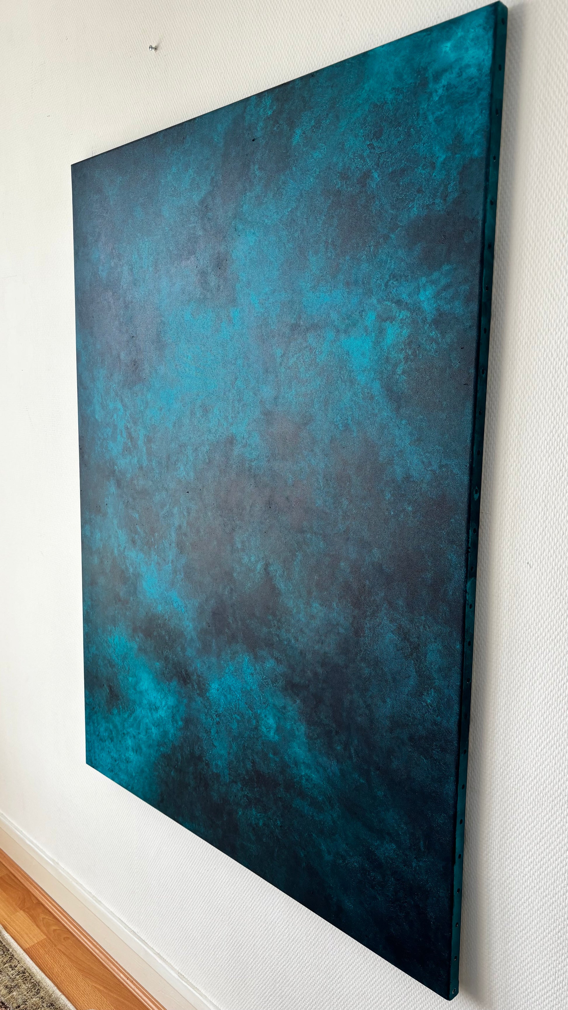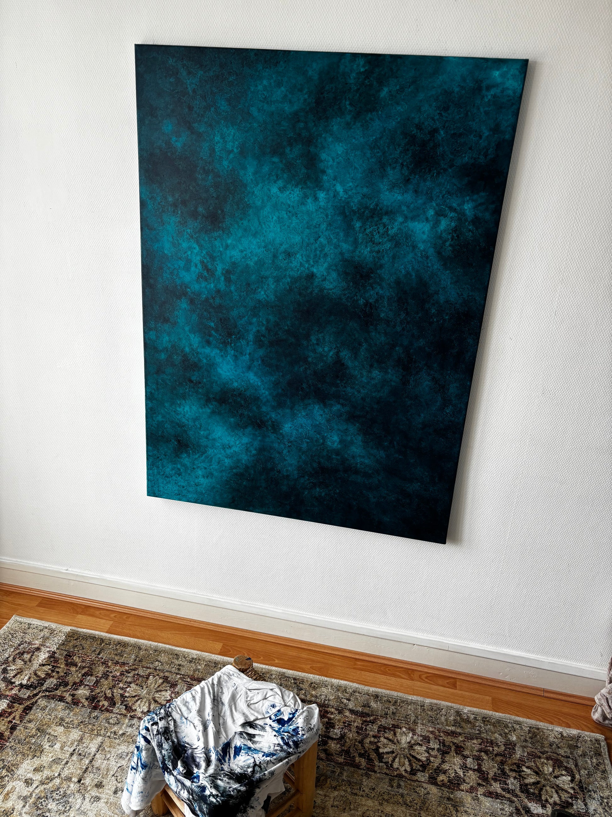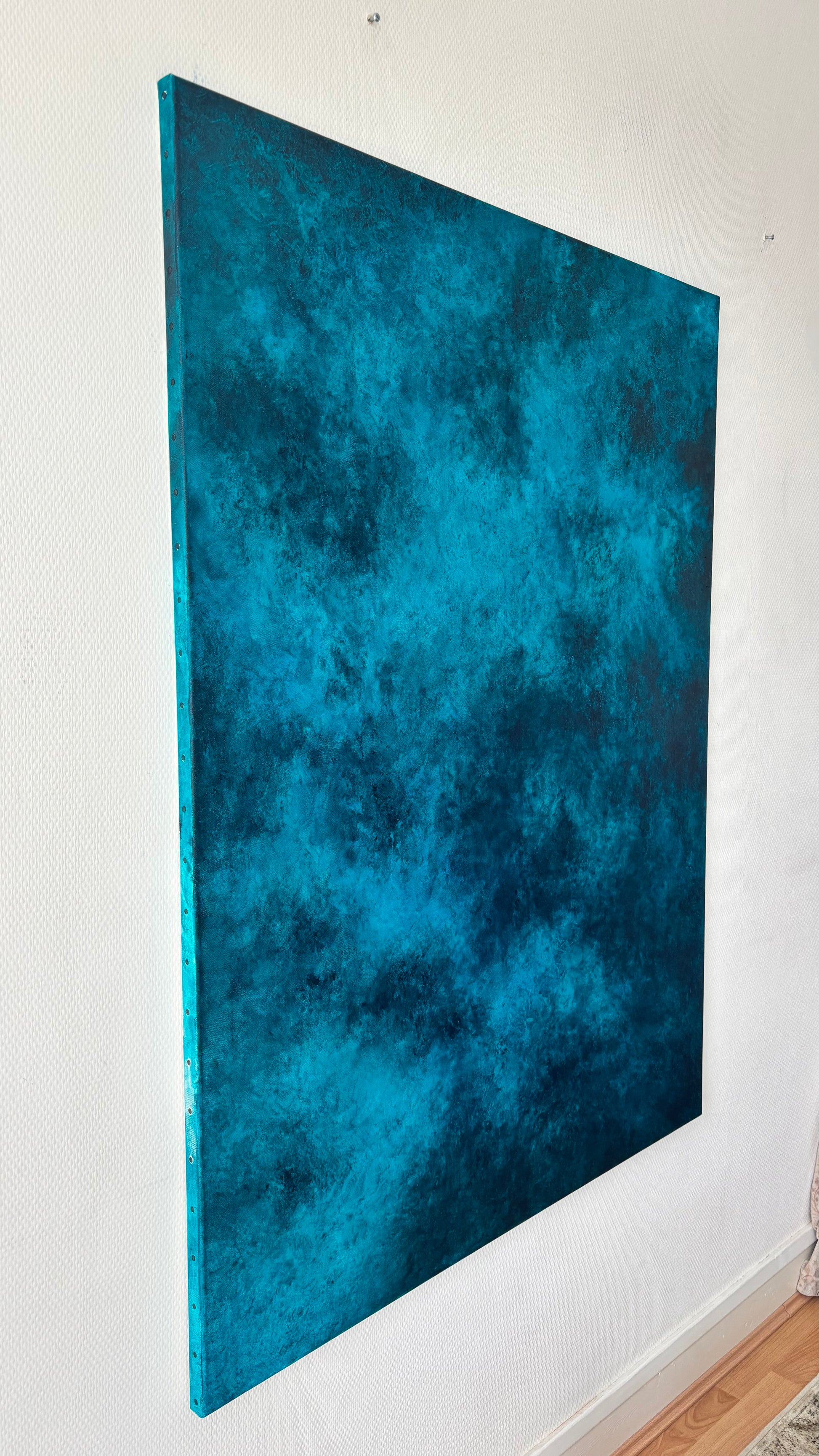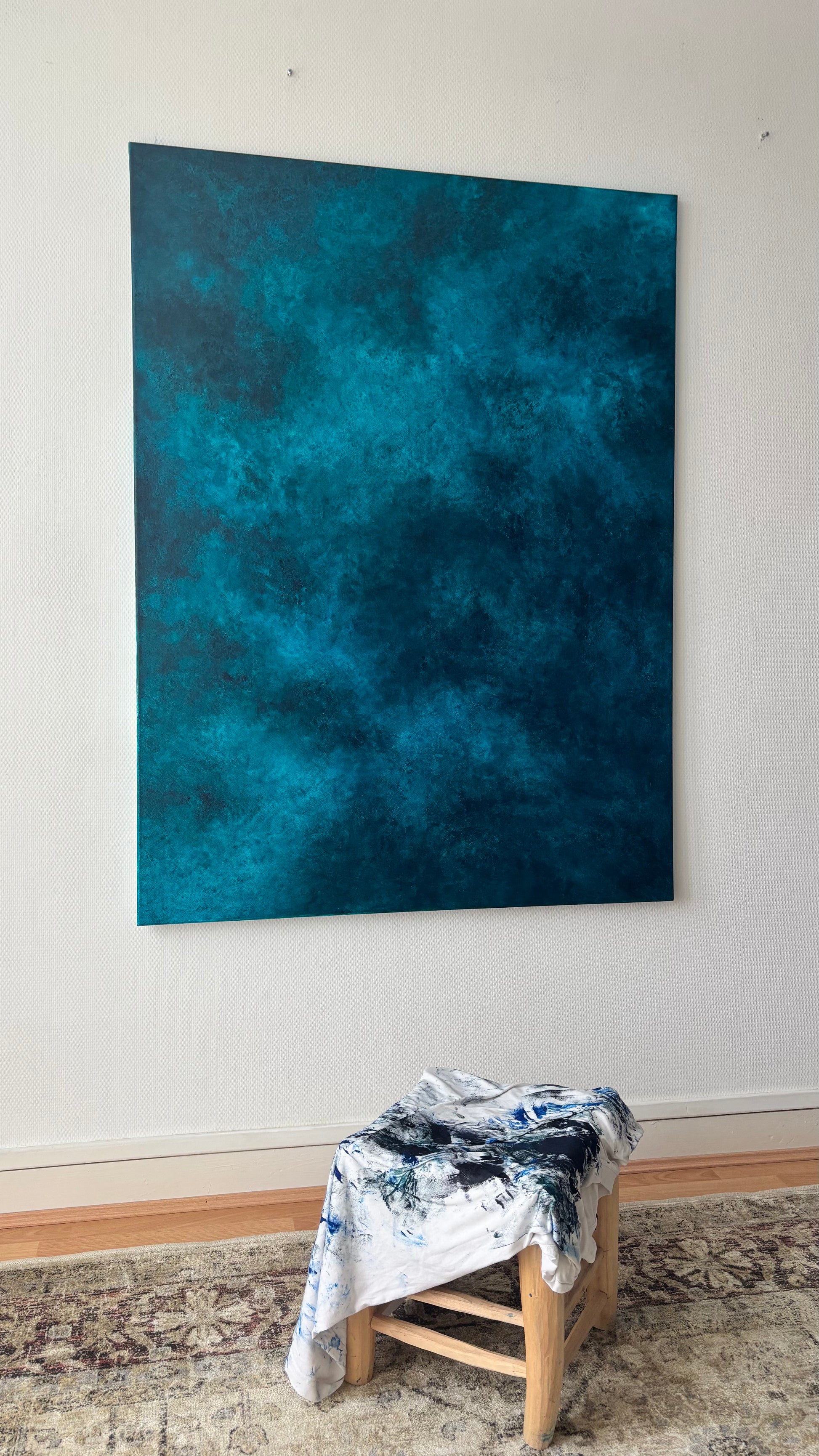 J’ai choisi de non vernir mes toiles pour laisser l’œuvre continuer à vivre et bouger comme l’océan, pour moi vernir un tableau sert à figer le moment, le temps, ce qui n’est pas dans mon processus de réalisation.