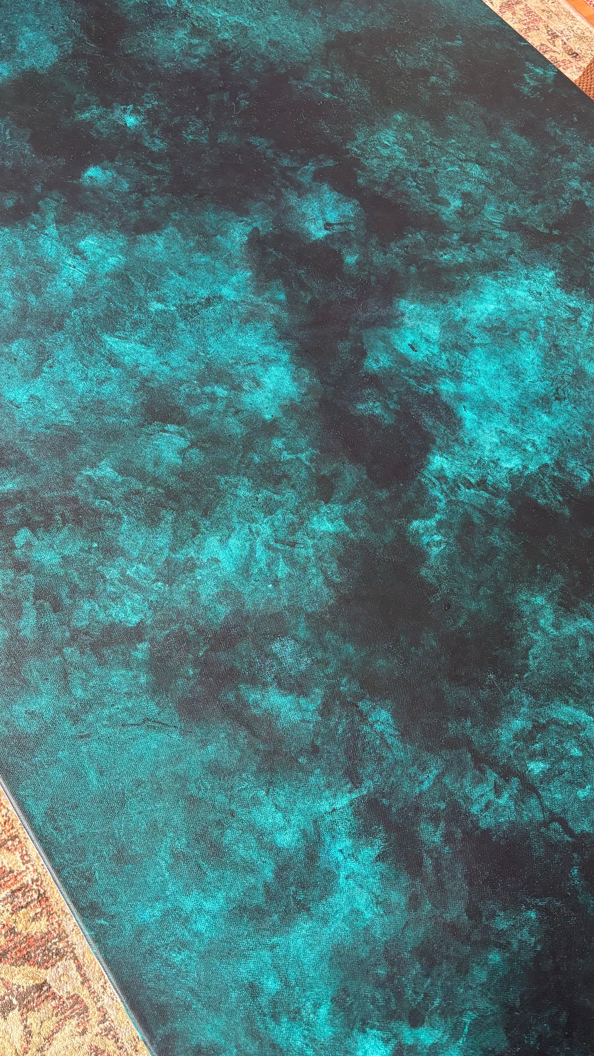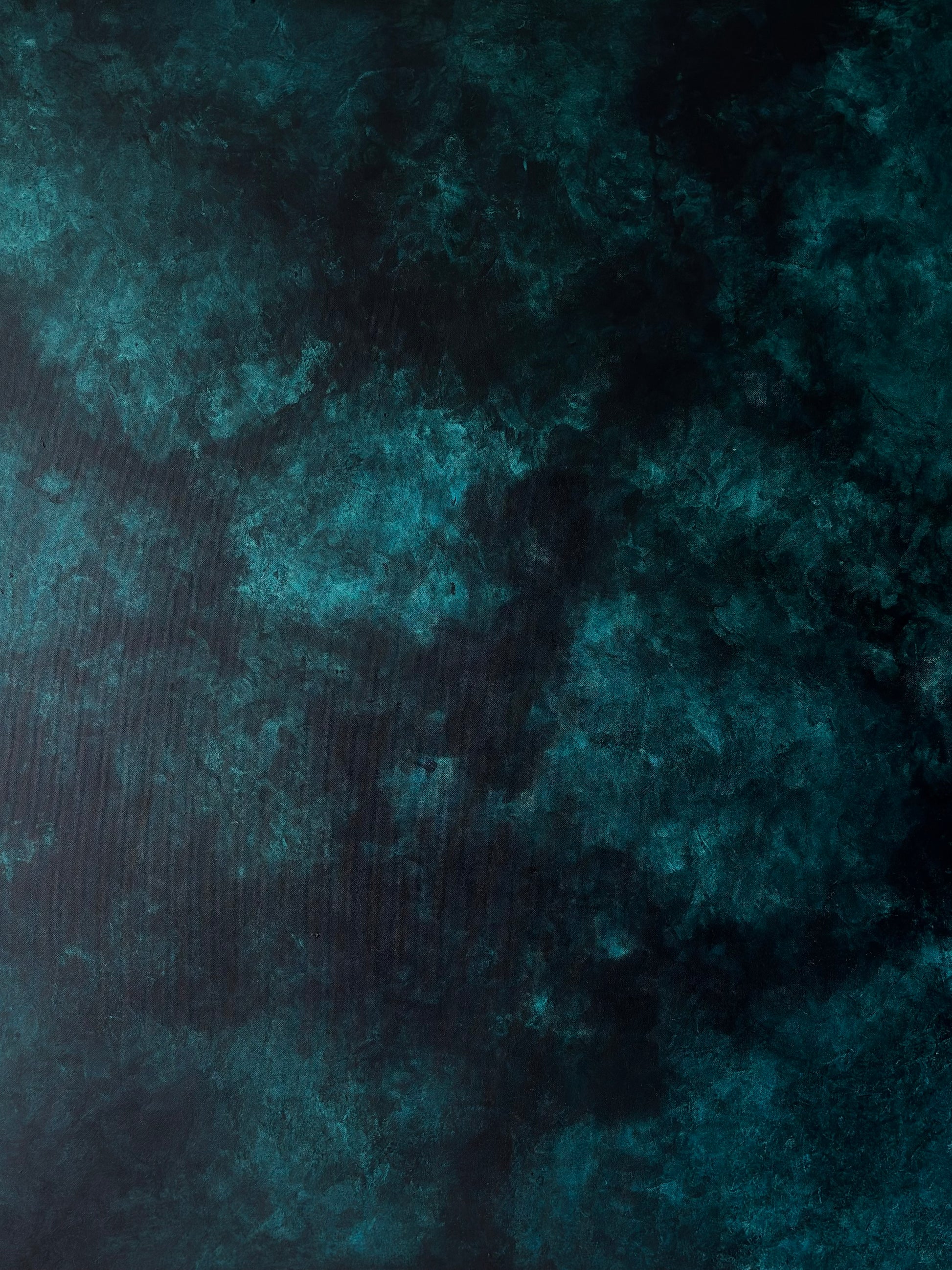 J’ai choisi de non vernir mes toiles pour laisser l’œuvre continuer à vivre et bouger comme l’océan, pour moi vernir un tableau sert à figer le moment, le temps, ce qui n’est pas dans mon processus de réalisation.